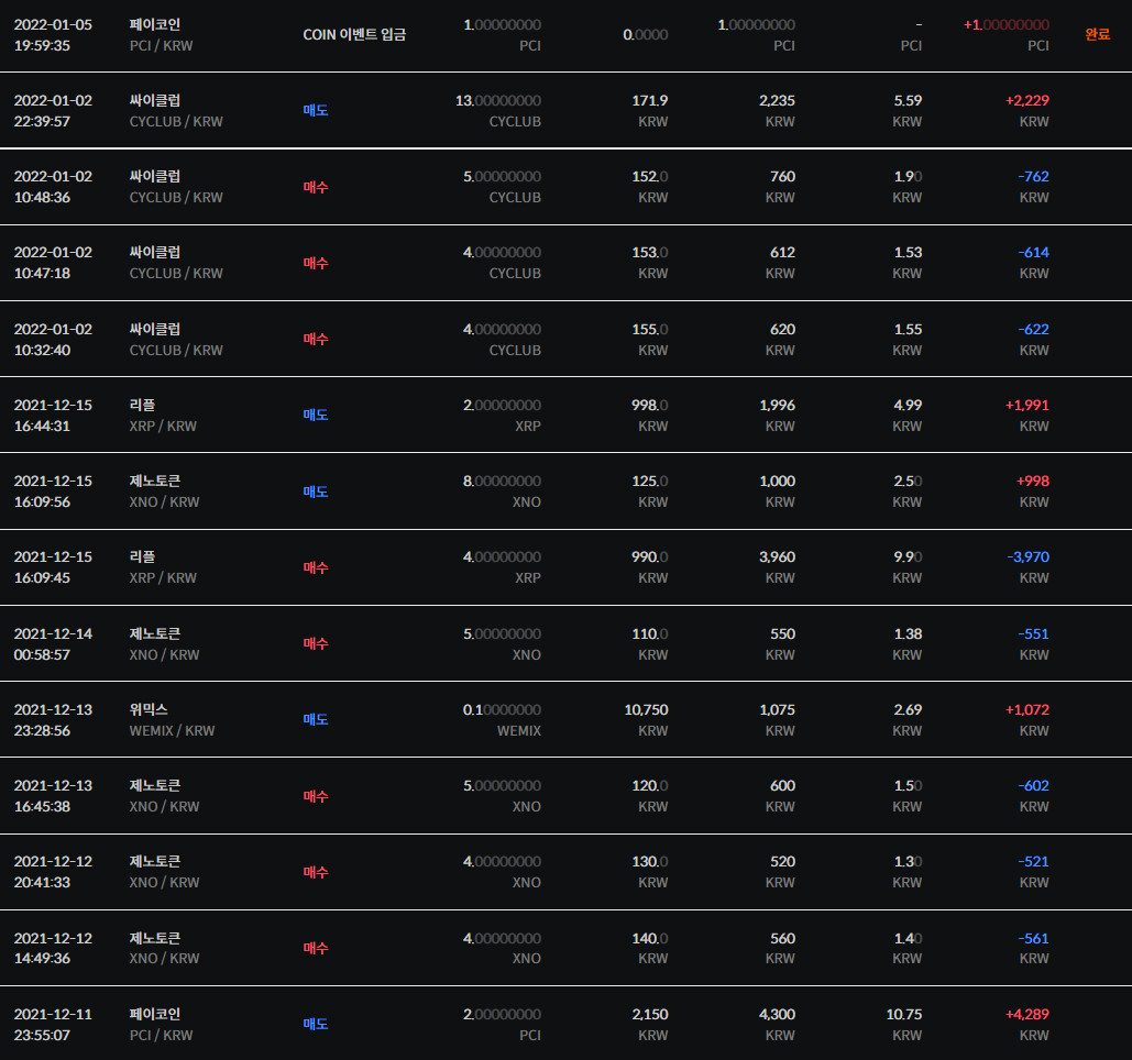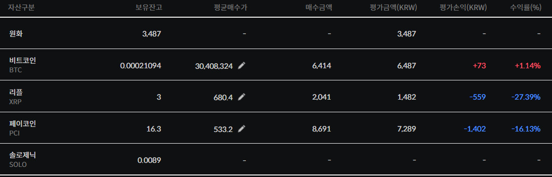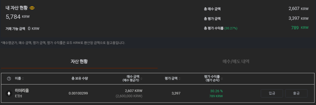 현금 입금 없이 이벤트로 받은 금액과 코인으로만 거래하고 있음.