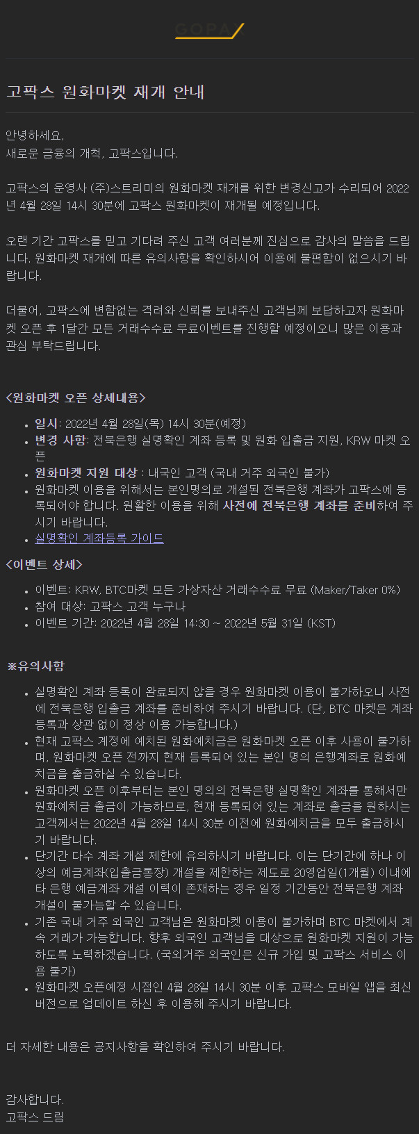 ** 2022.04.26 : [GOPAX] 고팍스 원화마켓 재개 관련 안내(4/28 예정)