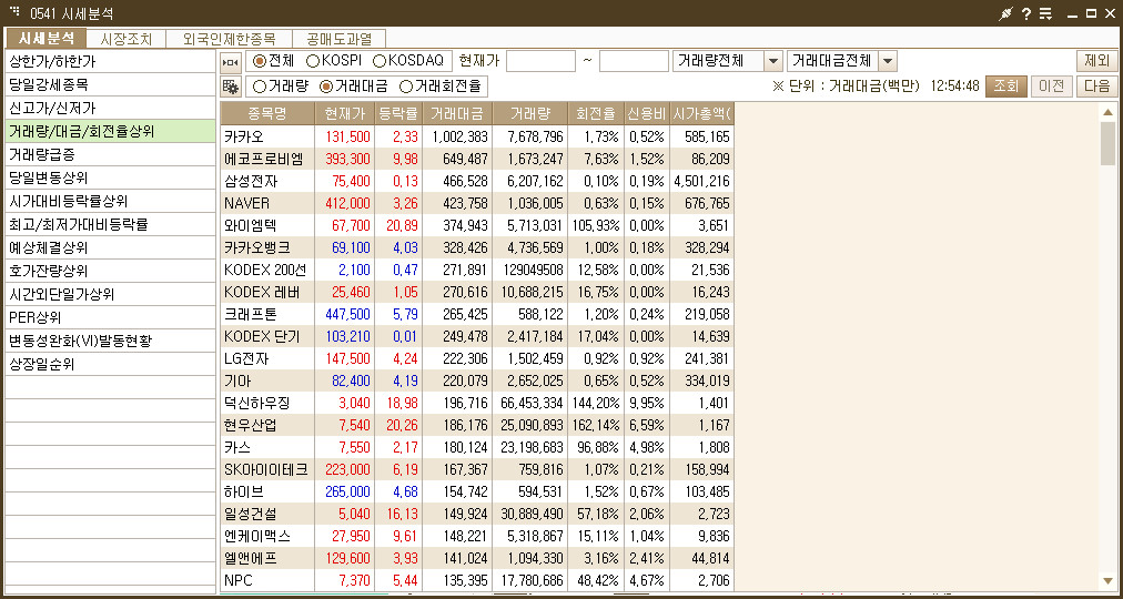 2) 거래량 종목 : 거래량 상위, 거래량 증가 상위, 거래대금 상위, 시간외매수잔량 상위,..