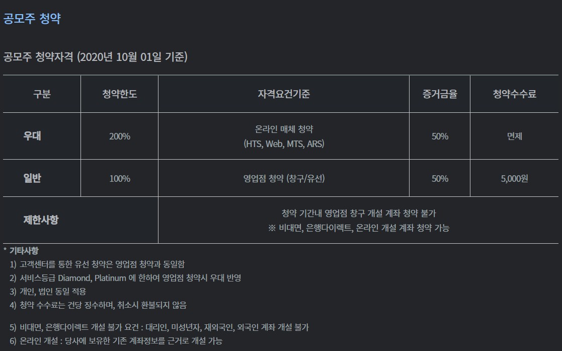 | 구분 | 온라인(홈페이지,HTS,ARS 등)를 통한 청약 | 키움금융센터를 통한 청약우대고객일반고객 |