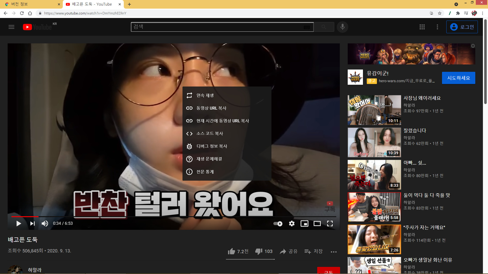 1. 유튜브 영상 위에서 마우스 오른쪽 버튼을 한 번 누르면 이런 팝업창이 뜬다.
