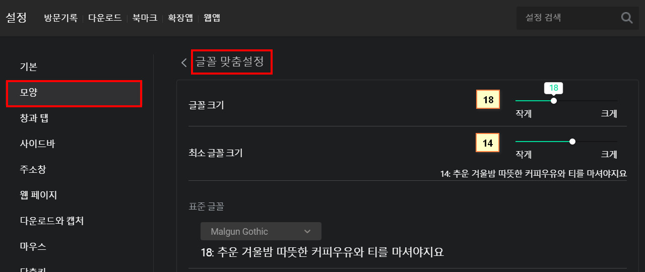 스킨 > 다크 모드 사용하기 + 웹 페이지에 다크 모드 적용하기를 활성화 하면 적용된다.