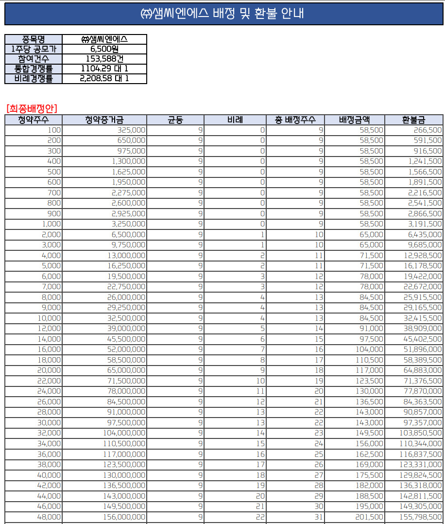 주2) 균등배정에서는 총 청약 건수 153,588건에 9주씩 배정하였고, 균등 잔여주식 117,708주는 전체 청약단위 대상으로 무작위 추첨배정 하였습니다.