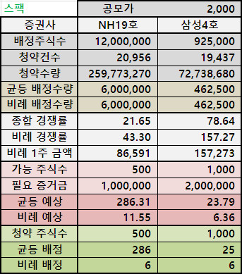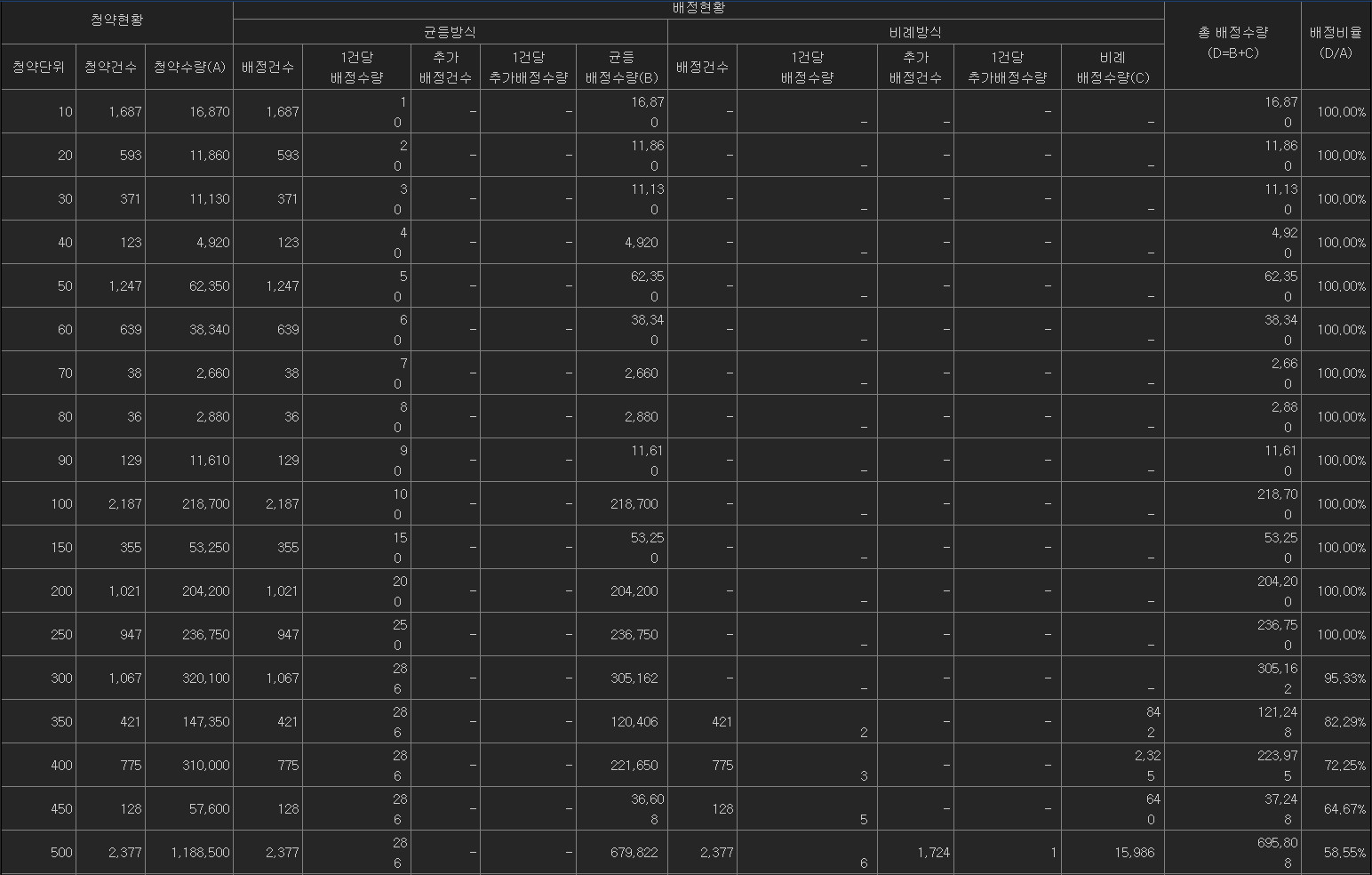 | 배정수량 | 균등 : 286주 + 비례 : 6주 = 합계 : 292주 | 균등 : 25주 + 비례 : 6주 = 합계 : 31주 |