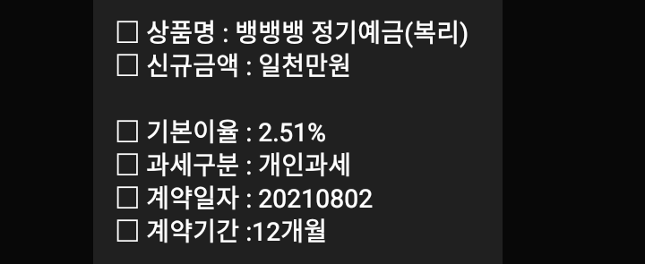 | [2021.07.19] 세람저축은행, 정기예금 만기 (500만원, 2.8%, 24개월) (0) | 2021.07.19 |