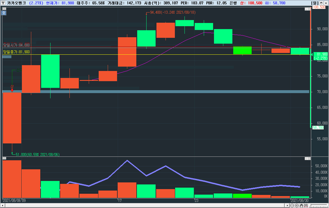 공모가 39,000원짜리 주식이 계속 상승해서 94,400원까지 오르더라.