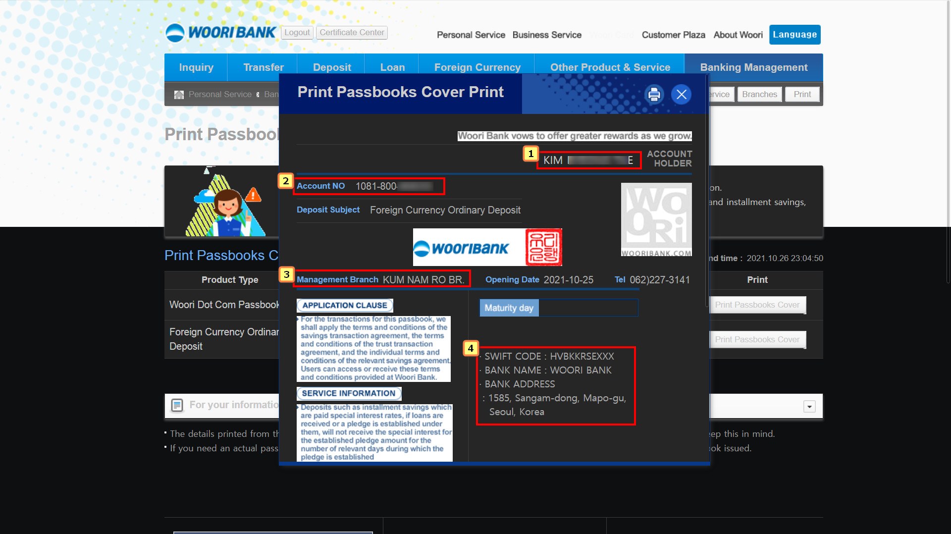 그 중에서 외화보통예금 오른쪽에 있는 `PRINT PASSBOOKS COVER`를 클릭한다.