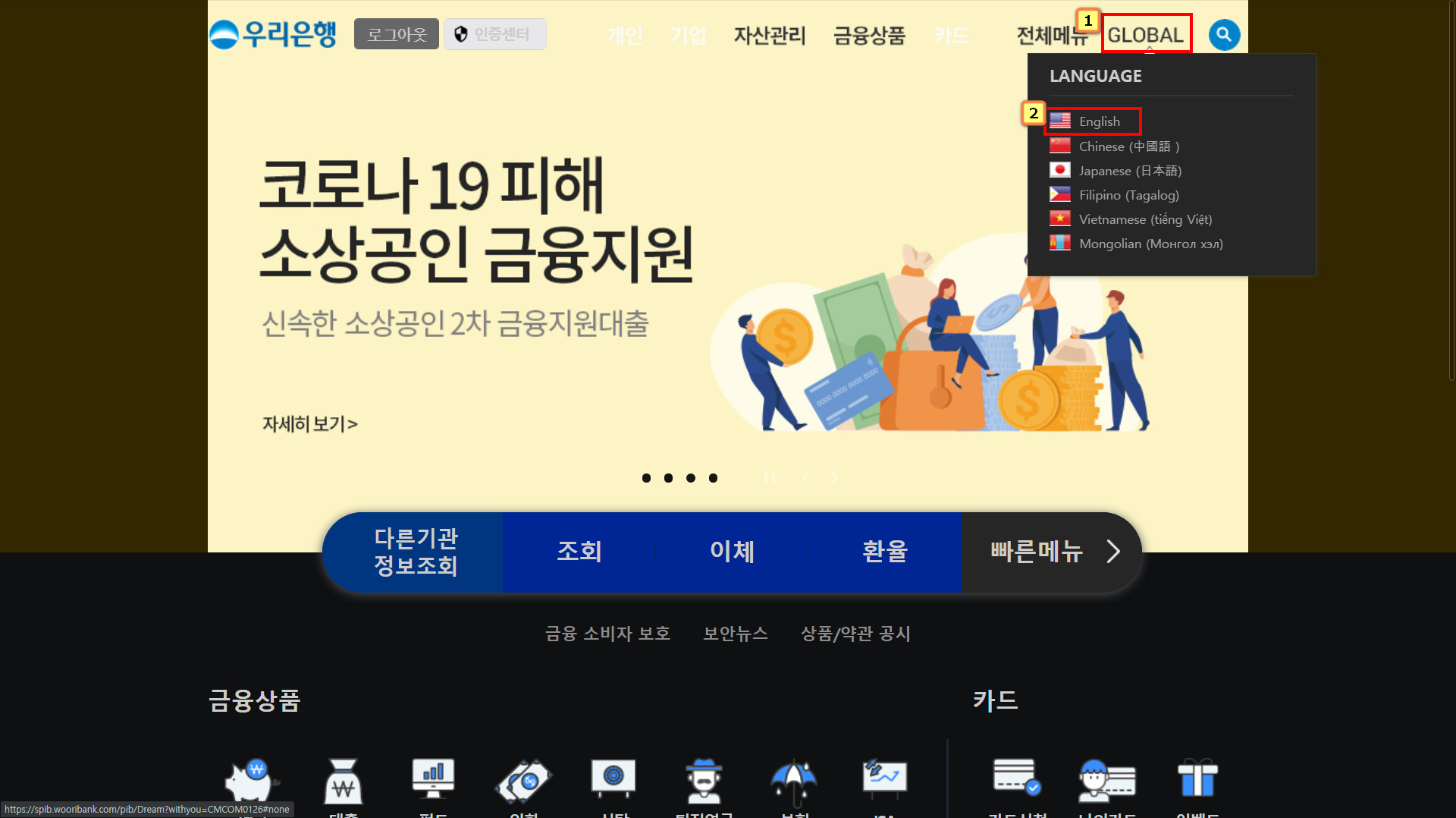 (우리은행 홈페이지 → 상단우측 GLOBAL→ ENGLISH →