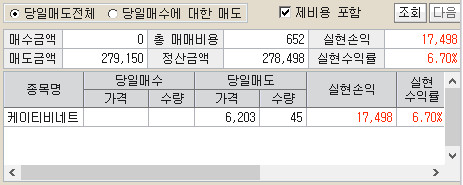 몇 분이 지나서 다시 현재가 창에 숫자들이 움직이고 차트 화면이 뜨는데 잔고에는 이미 수량이 사라져 있었고 실현손익에는 숫자가 찍혀있더라.