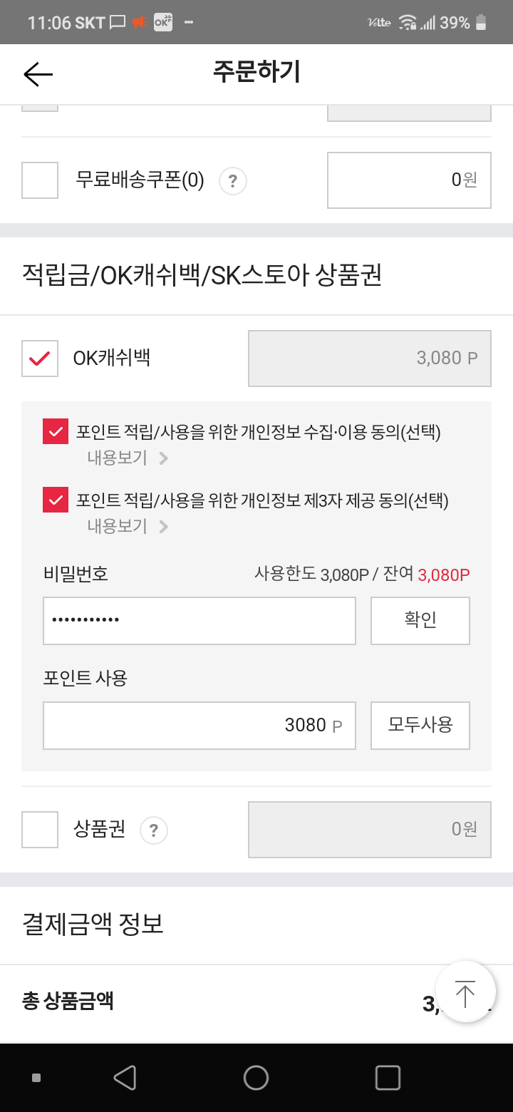 OK캐쉬백 포인트로 결제를 하면 투툼 포인트가 결제된다.