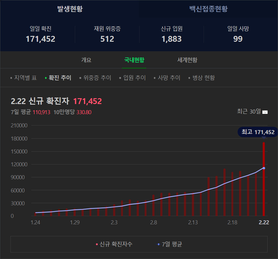 코로나 신규확진 17만1452명, 하루새 7만여명 폭증
