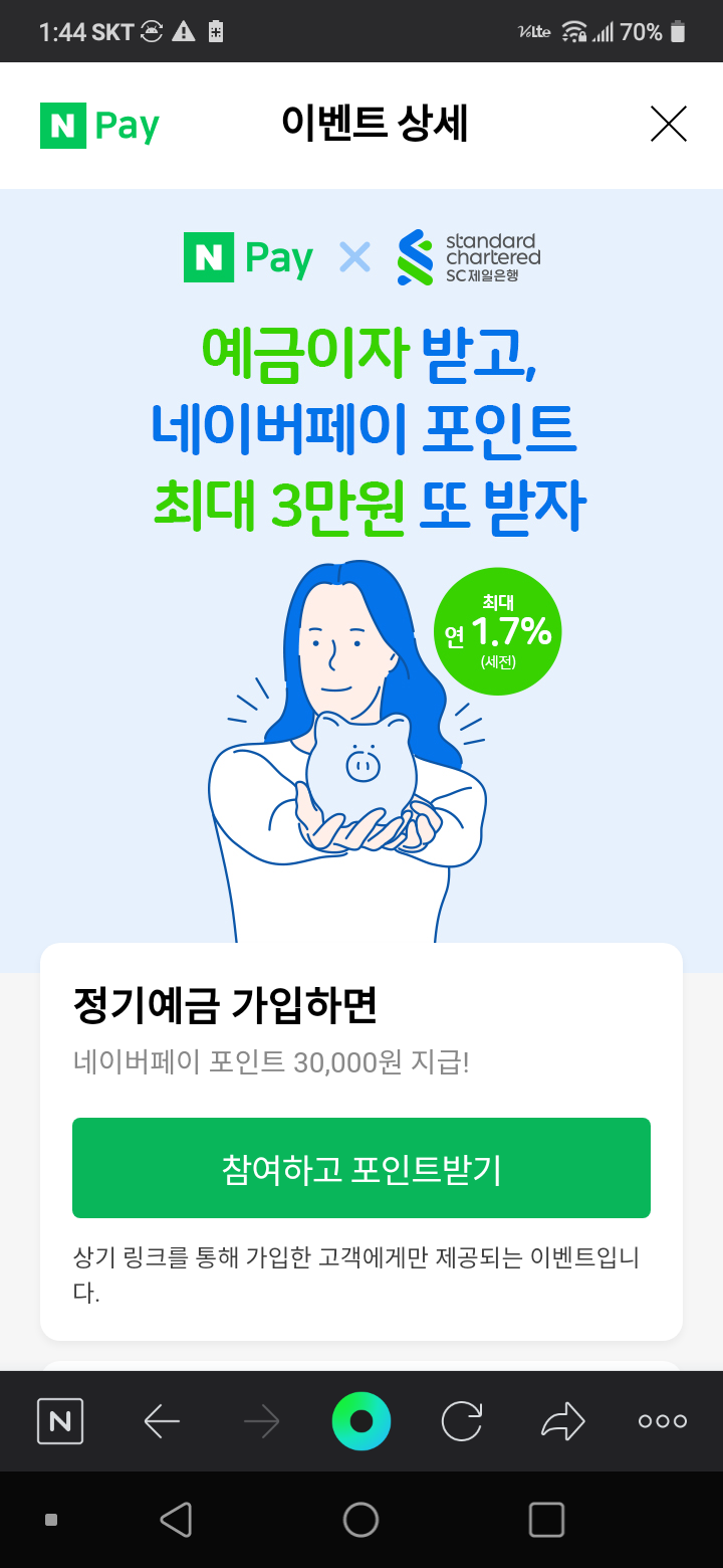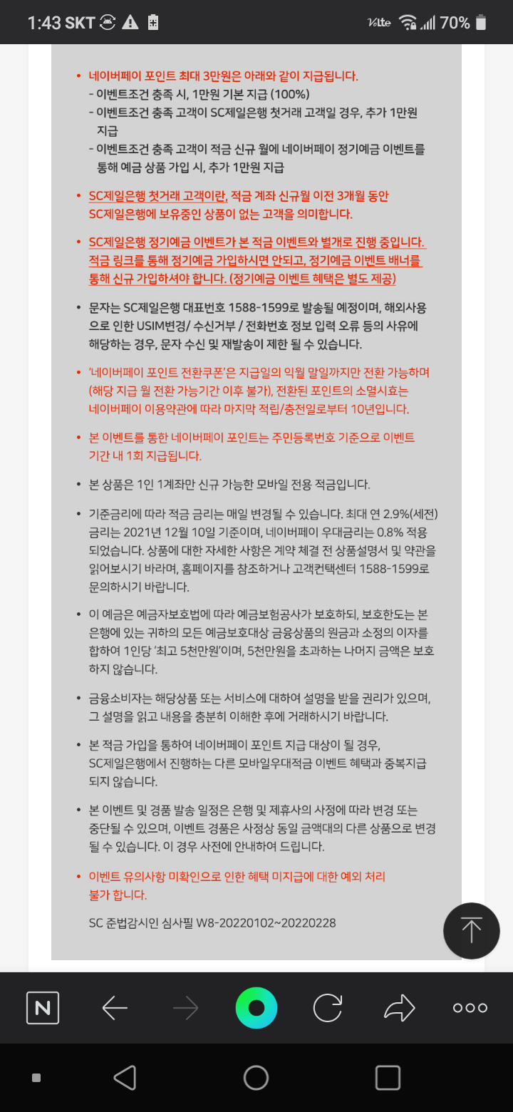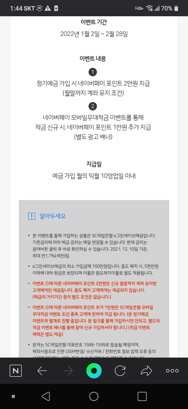 [2022.02.14] SC제일은행 정기예금, 정기적금 가입 이벤트 : 네이버페이 포인트 전환 쿠폰 지급 문자 받음