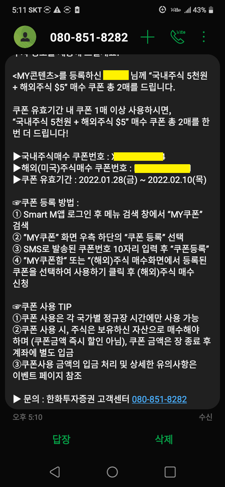 MY콘텐츠 등록 쿠폰 문자가 어제 도착했다.