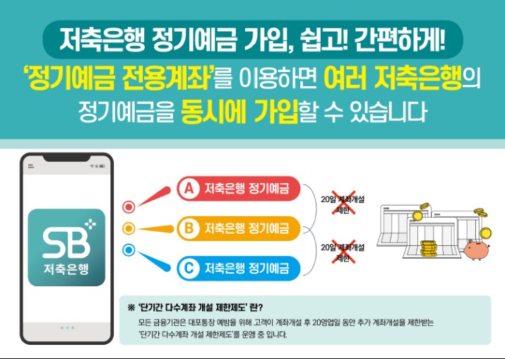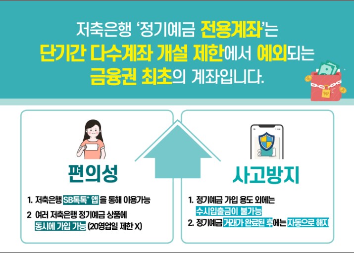 저축은행 '정기예금 전용계좌'는 단기간 다수계좌* 개설 제한에서 예외되는 금융권 최초의 계좌입니다.
