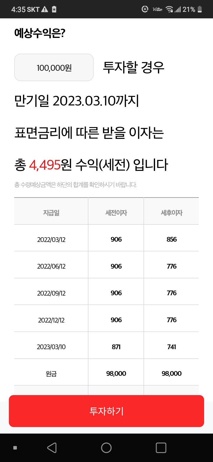 | [2022.06.27] 엠캐피탈275-2 채권투자 (400만원 x 5.47% x 431일) (0) | 2022.06.27 |