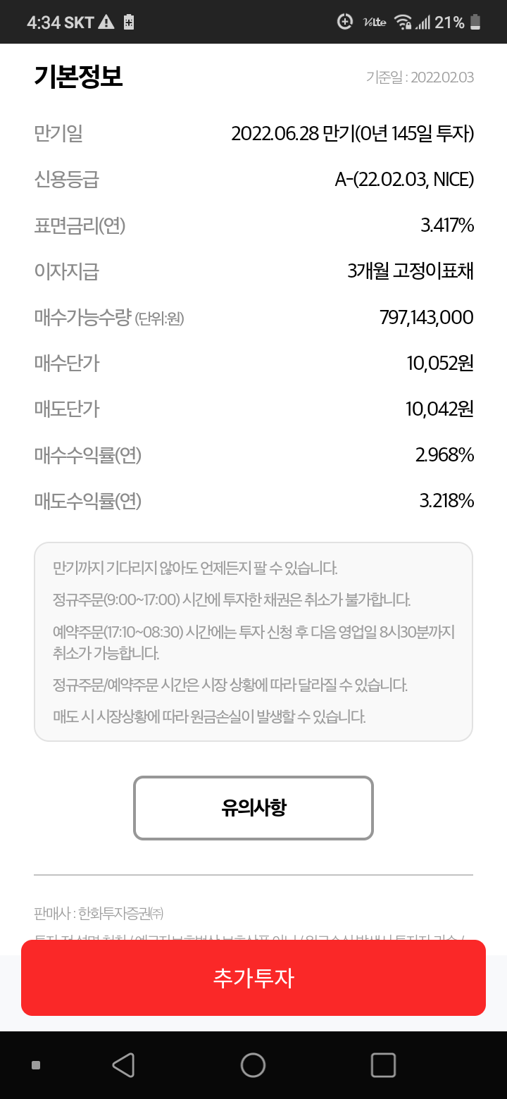 만기가 얼마 남지 않은 `하이트진로홀딩스169`에 추가투자를 시도해 봤는데
