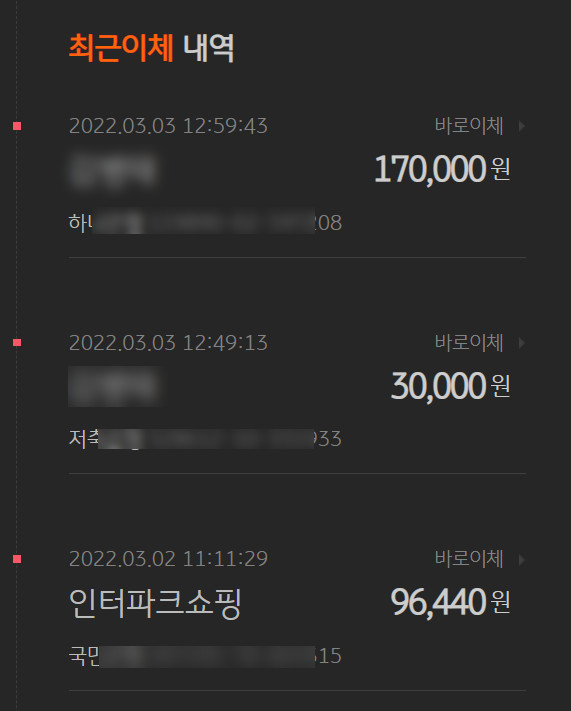 *PC 인터넷뱅킹에서는 로그인 후 왼쪽 상단에 `개인`을 누르고, 화면 왼쪽에 최근이체 내역을 보면 나온다.
