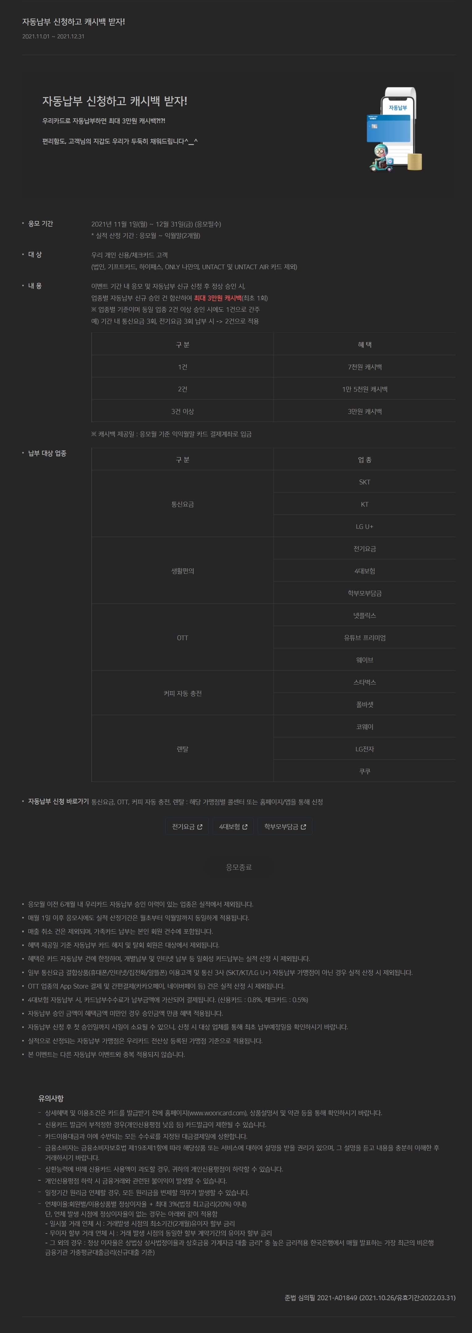 내용 : 이벤트 기간 내 응모 및 자동납부 신규 신청 후 정상 승인 시, 업종별 자동납부 신규 승인 건 합산하여 최대 3만원 캐시백 (최초 1회)