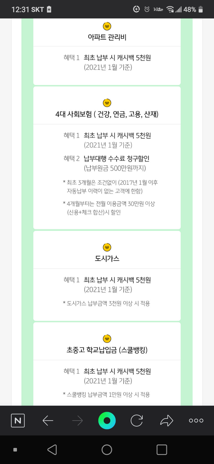 캐시백 : 최초 납부 다음 달 20일 경 (KB국민카드 결제계좌로 입금 예정)