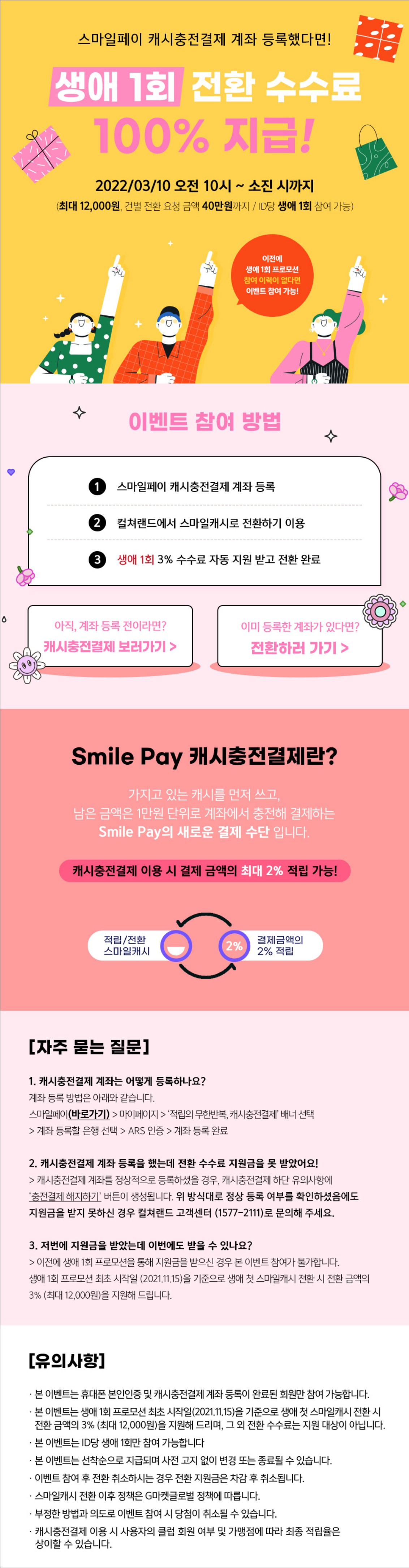 [2022.01.05] 컬쳐랜드 컬쳐캐쉬 -> 스마일캐시 전환 수수료 지원 : https://weezzle.tistory.com/1749