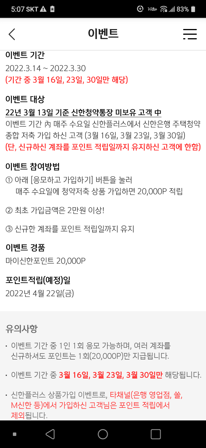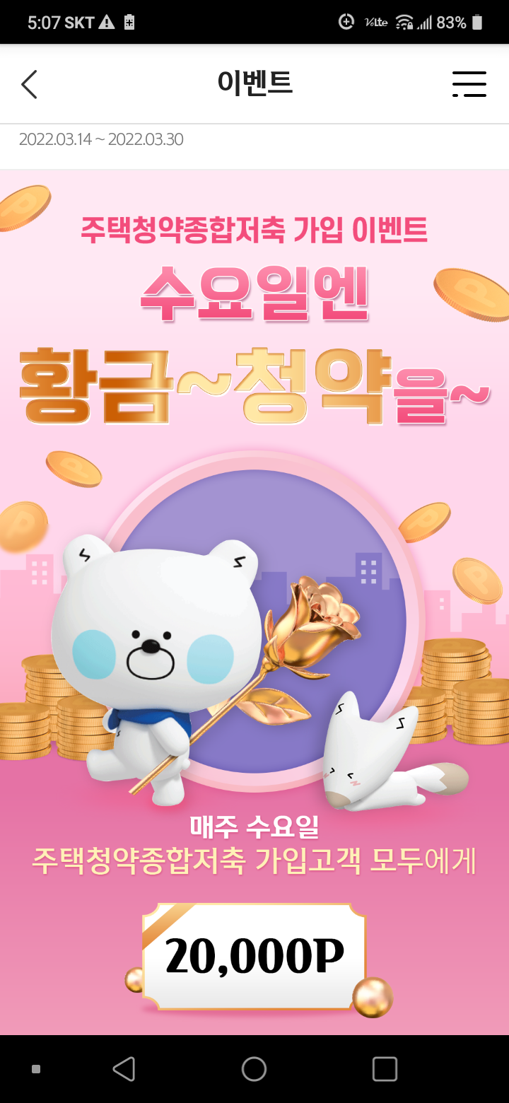 | [2022.03.21] 하나머니, 하나은행 주택청약 가입 이벤트 (하나머니 10,000원) (0) | 2022.03.21 |