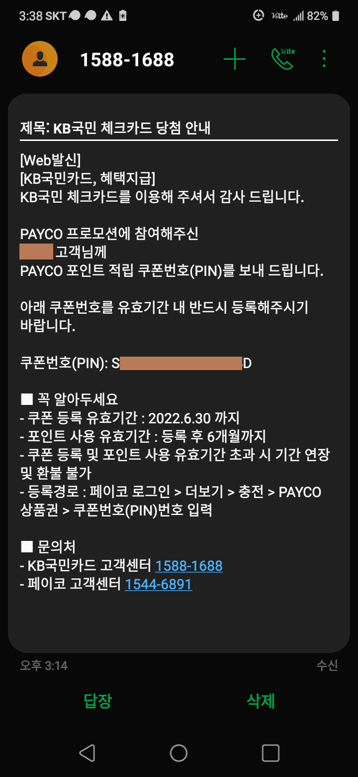 PAYCO 포인트 적립 쿠폰번호 문자가 도착했다.