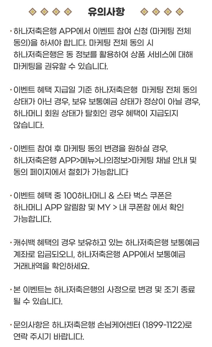 혜택 : 캐쉬백 3,000원 + 스타벅스 아메리카노(T) 쿠폰 + 하나머니 100머니