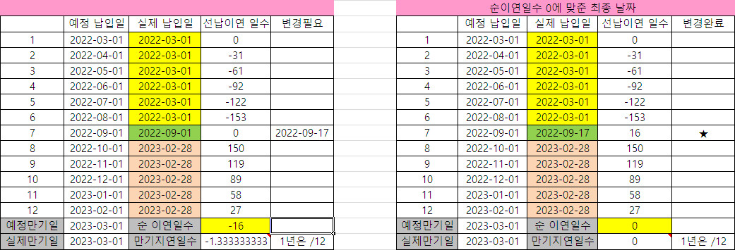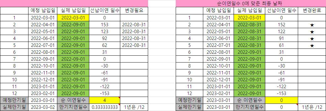 `실제 납입일`에서 `예정 납입일`을 빼면 `선납이연 일수`를 구할 수 있음.