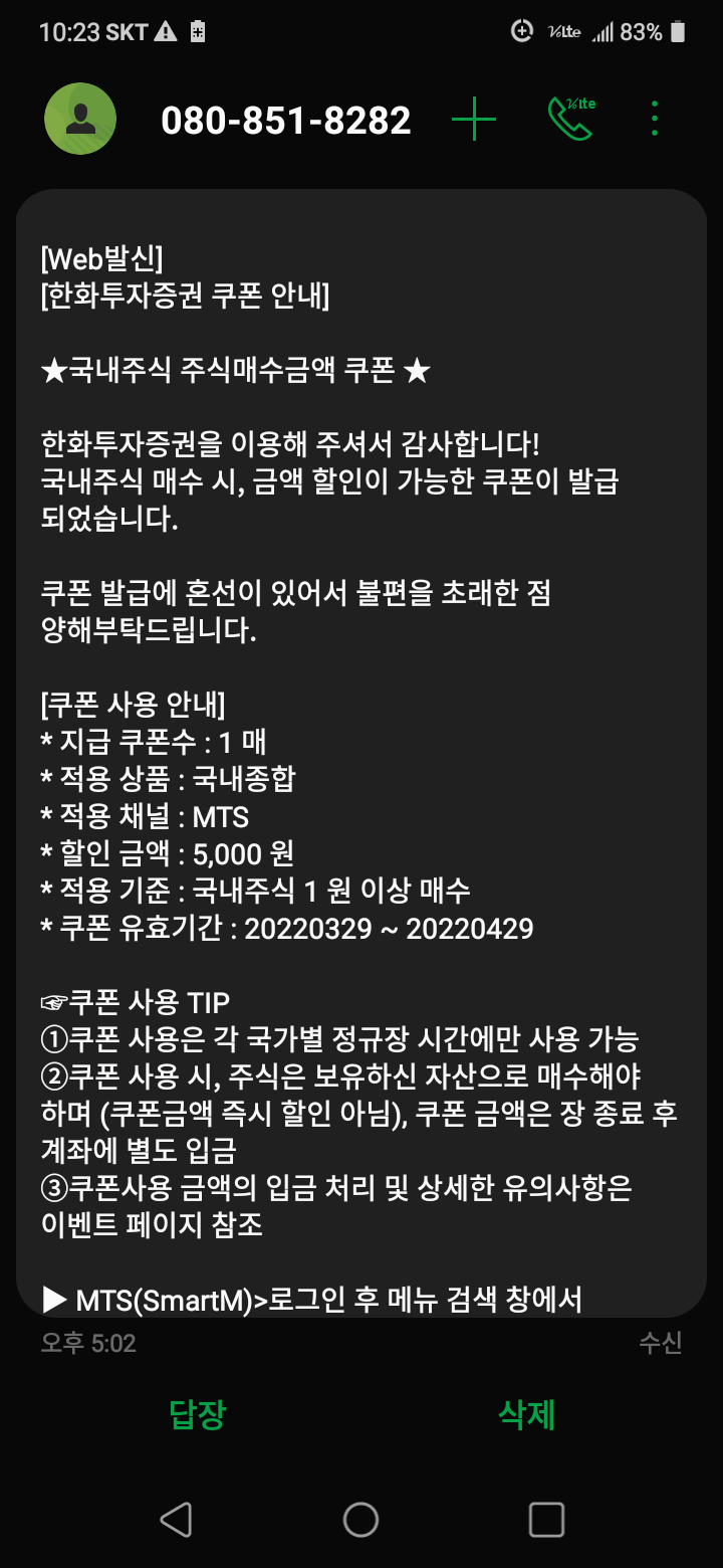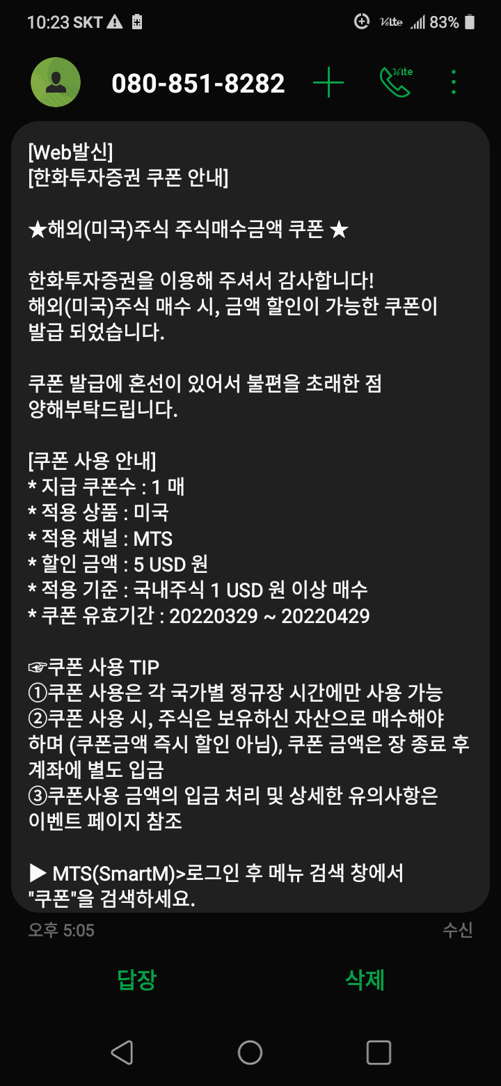 한화투자증권 주식쿠폰 문자 받음
