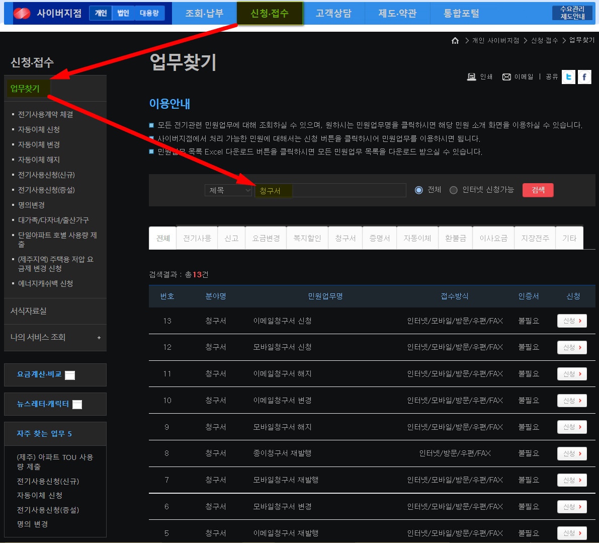 메뉴 :: 신청접수 >> 업무찾기 >> 청구서 (검색)