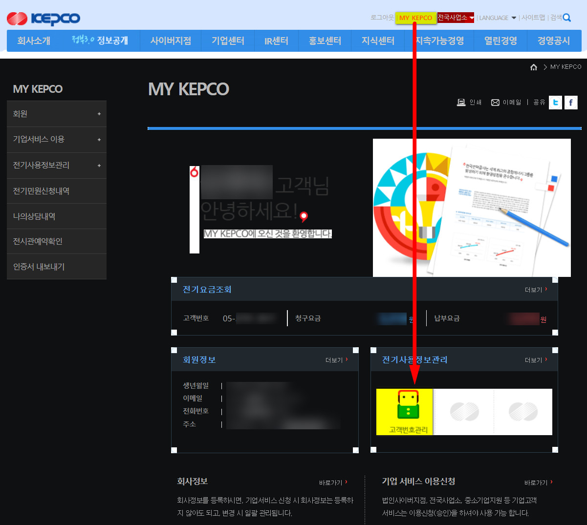 1) 화면 상단에 `MY KEPCO` 를 클릭하고, `고객번호관리`를 클릭한다.