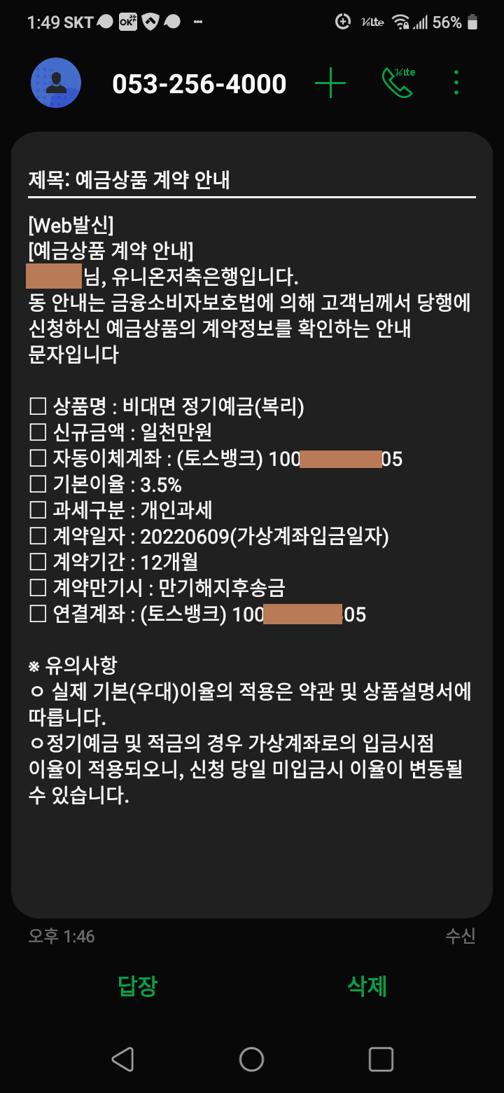 그 돈으로 유니온저축은행 정기예금에 가입을 했다.