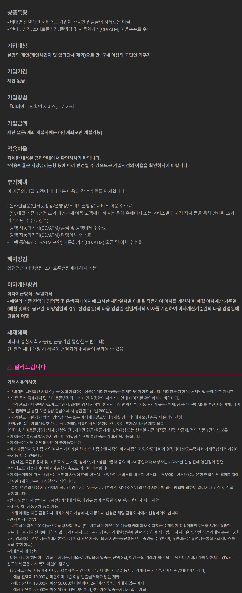 ■ 상품특징 : 비대면 실명확인 서비스로 가입이 가능한 입출금이 자유로운 예금