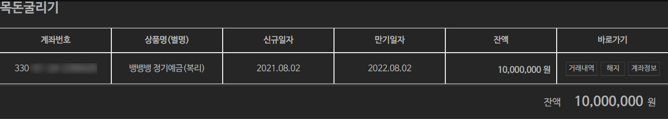 지금은 20일 계좌개설제한 상태라서 일단 파킹통장에 넣어두고 기다렸다가 다시 정기예금에 넣어야겠음.