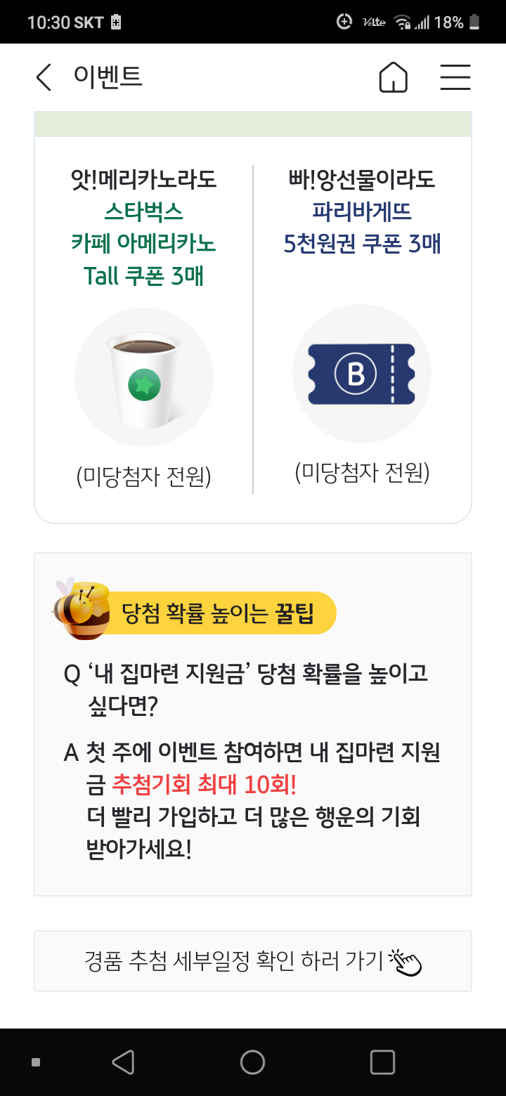 이미 이벤트가 시작된지 꽤 돼서 내 집마련 지원금은 의미가 없고, 파리바게트 5천원권 3개 정도는 기대할 수 있을 듯..