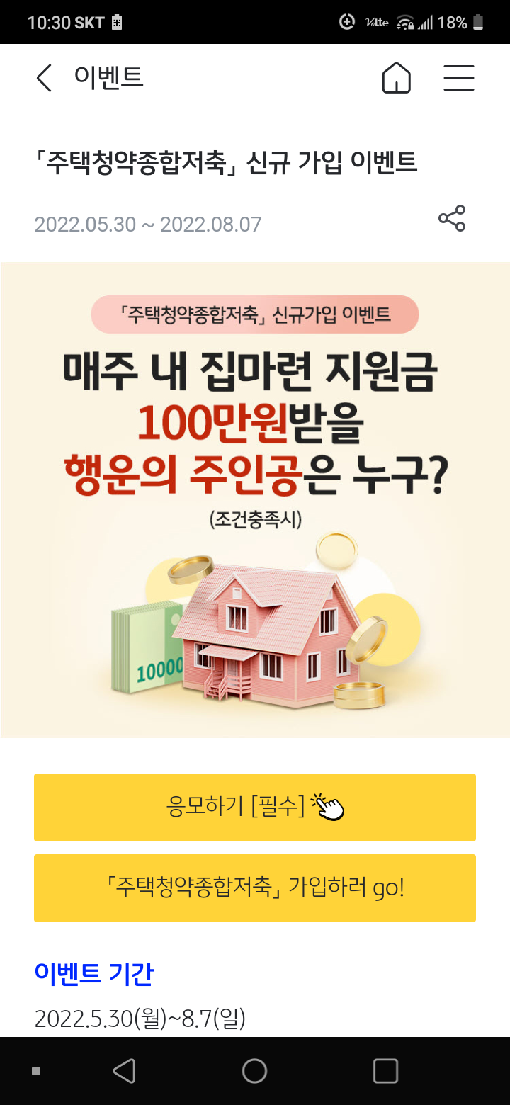 청약통장 신규가입하고 이벤트 응모하면 내 집마련 지원금 매주 1명에게 현금 1백만원을 주고,