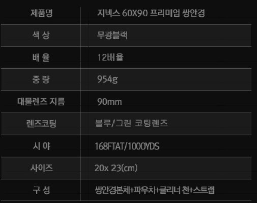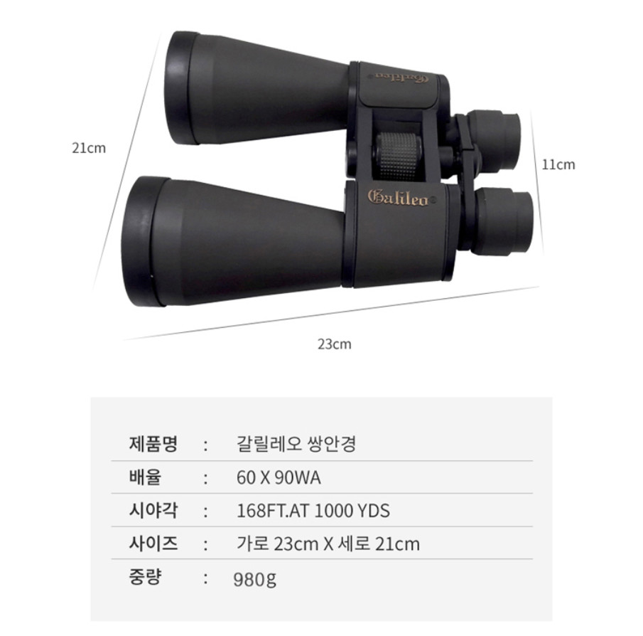 구매후기에서 확인 : 정확한 스펙 이 제품은 60x90 (60배율 대물 90mm구경)이 아닙니다 렌즈 좀 아시는분은 이 가격대에 60배율이 얼마나 터무니없는 소리인지 잘 아실겁니다. 역시 뻥스펙이며 직접 수령 후 실측해보니 8.5배율 60구경으로 확인 되었습니다