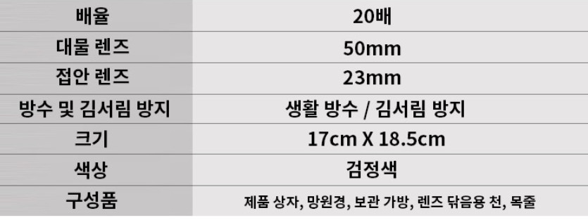 [제품설명] 배율 20X, 대물렌즈 50mm, 접안렌즈 20mm, , 시야 56 / 1000, 필드각도 : 8.2도, 무게 886g
