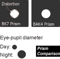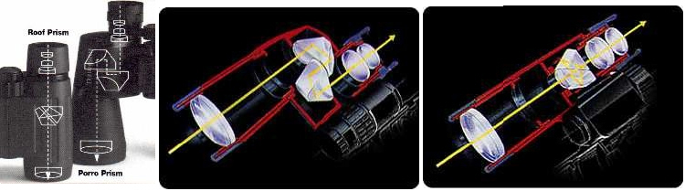 쌍안경의 전통적인 설계방식에서는 포로 프리즘(Porro prisms)을 사용합니다. 사용되는 유리에는 두 가지의 종류가 각각 있습니다. BAK-4 재질의 유리는 상대적으로 값싼 BAK-7에 비해 우수한 성질이 있습니다. 더욱 최근에는 매우 컴펙트한 쌍안경을 만들 수 있도록 루프 프리즘(roof prisms)이 사용되기 시작하였습니다. 그러나 이 방식은 쌍안경의 성능이 재대로 발휘되려면, 매우 높은 정밀도에 의해 만들어 져야 합니다. 그러므로 루프 프리즘 방식이 채택된 양질의 쌍안경은 가격이 비싸집니다.