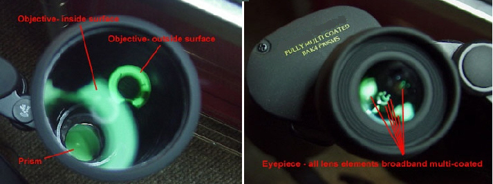 대물렌즈의 구경이 쌍안경이 이용할 수 있는 빛의 양을 결정한다는 것에는 예외가 없습니다. 빛의 일부는 쌍안경의 렌즈, 프리즘의 초자(유리)와 공기의 경계면에서(쌍안경의 한쪽 경통에는 약 14~22개의 경계면이 있습니다-역주) 에서 반사되어 버립니다. 반사된 빛은 사방으로 흩어져 상대적으로 상의 어두운 부분이 밝아져(반사에 재반사를 거듭해 의미없는 빛이 우리눈에 들어오는 것이죠-역주) 상의 컨트라스트를 떨어뜨리게 될 것입니다. 좋은 쌍안경은 멀티코팅된 렌즈와 프리즘이 적용되어 있어 빛의 산란을 최소하 시켜 보다 좋은 상을 얻게 해줍니다. 따라서 코팅은 필연적으로 비용과 관련이 됩니다.