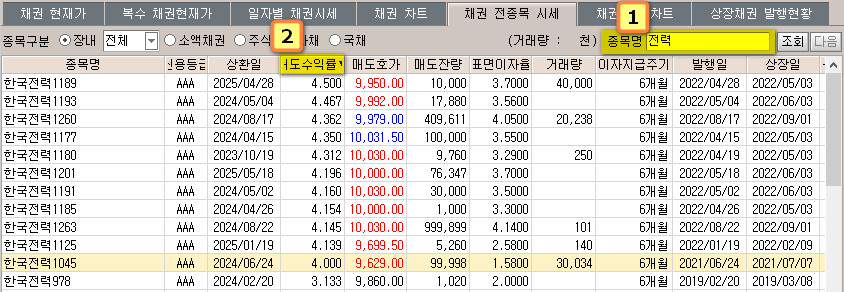 1) 장내채권에서 한국전력 회사채만 검색할 때