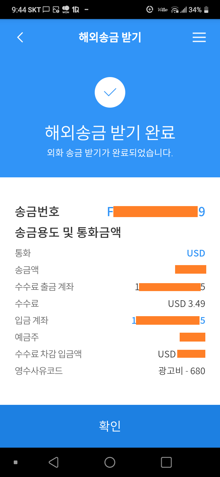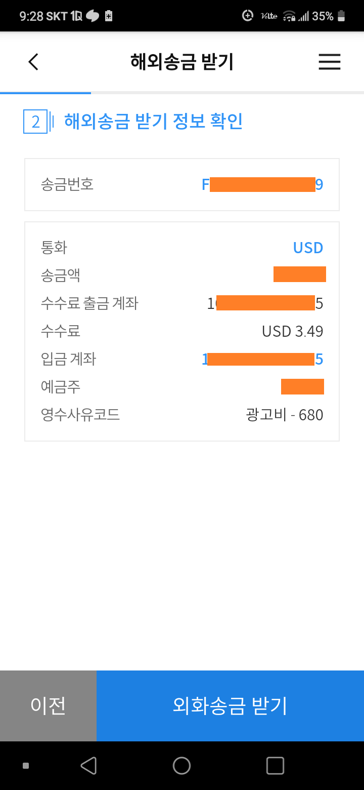 수수료 : 5천원 (3.49 달러) 차감 후 입금