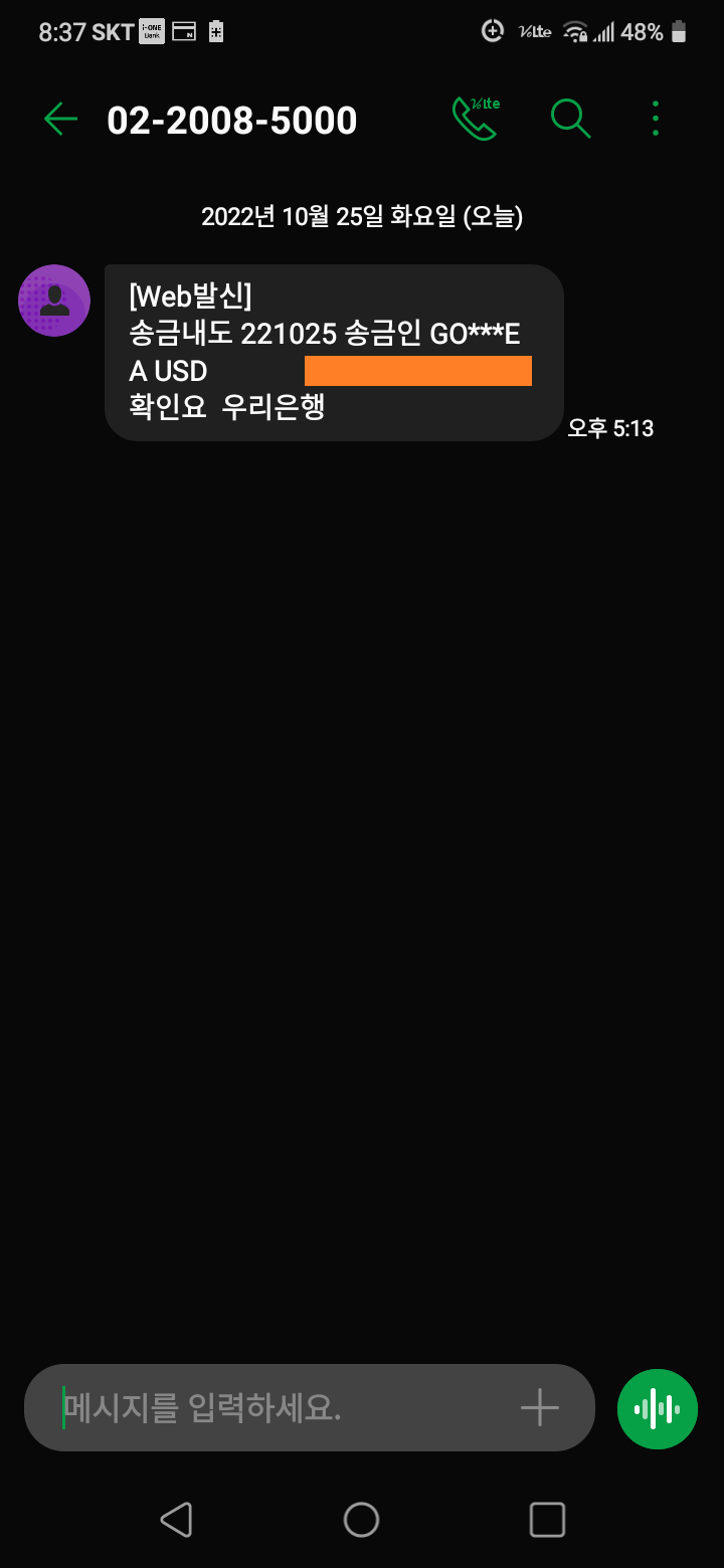 오후 5시 13분 송금도착통지 문자가 왔다.