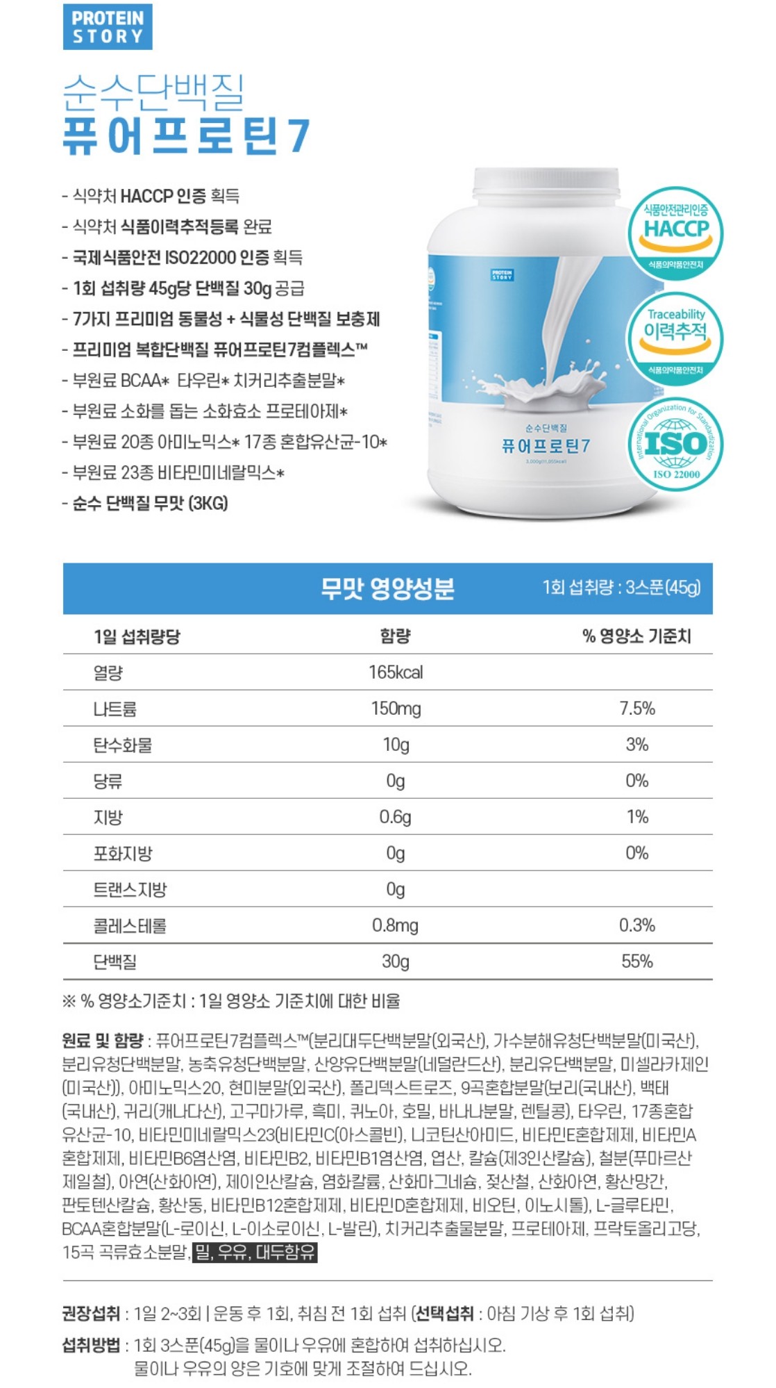 불필요한 첨가물 없음 : 수크랄로스 같은 인공감미료, 설탕, 말토덱스트린, 스테로이드, 트랜스지방, 소포제, 방부제 등