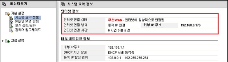 6) 무선 WAN 을 통한 연결이 정상적으로 이루어졌다면 아래와 같이 [시스템 요약 정보]에서 인터넷 연결 상태와