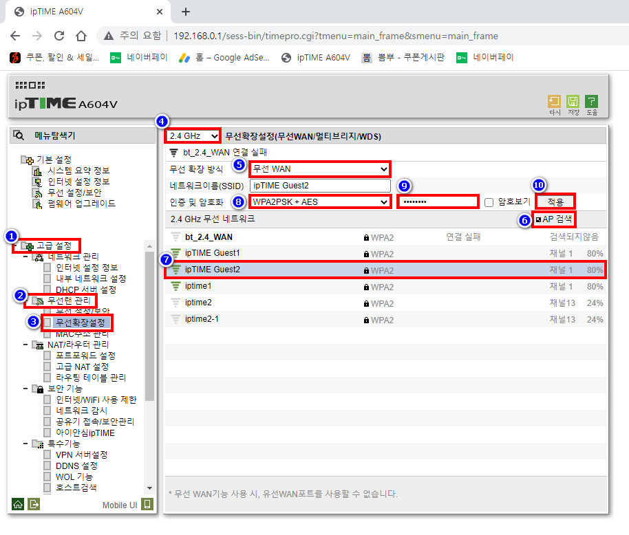 사용하는 기능으로, 다른 무선신호에 ipTIME 유무선 공유기를 무선으로 연결한 후 공유기에
