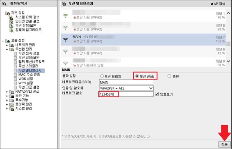 3) 하단에 동작설정을 [무선 WAN]으로 체크하고 ① 공유기/AP의 무선신호의 네트워크 암호를 정확히 입력 후 [적용] 버튼을 클릭합니다.