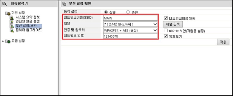 상위AP 또는 무선공유기(구성도의 ①에 해당)의 네트워크 이름(SSID) 및 보안설정을 확인합니다.