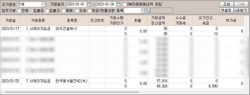 1월 채권 이자 입금내역은 2건 있었음.
