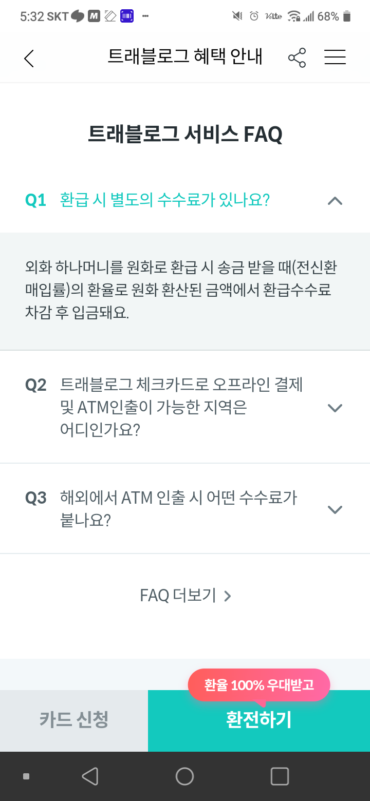 *트래블로그는 환율이 송금환율이 아니라 기준율+ 신용카드랑 다르게 수수료 면제라 실사용으로 나쁘지는 않아요